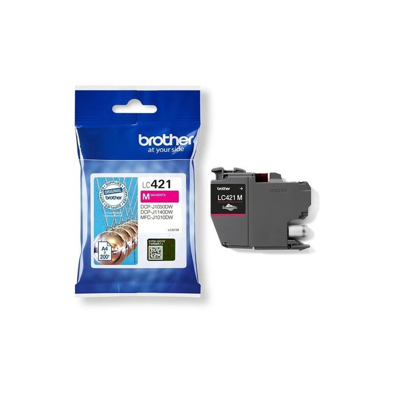 Description du produit Brother LC421M - magenta - original - cartouche d'encre Type de Produit Cartouche d'encre Technologie d'impression Jet d'encre Couleur d'impression Magenta Caractéristiques des cartouches Brother Innobella Rendement Jusqu'à 200 pages ISO/IEC 24711 Compatible avec Brother DCP-J1140DW.MFC-J1010DW