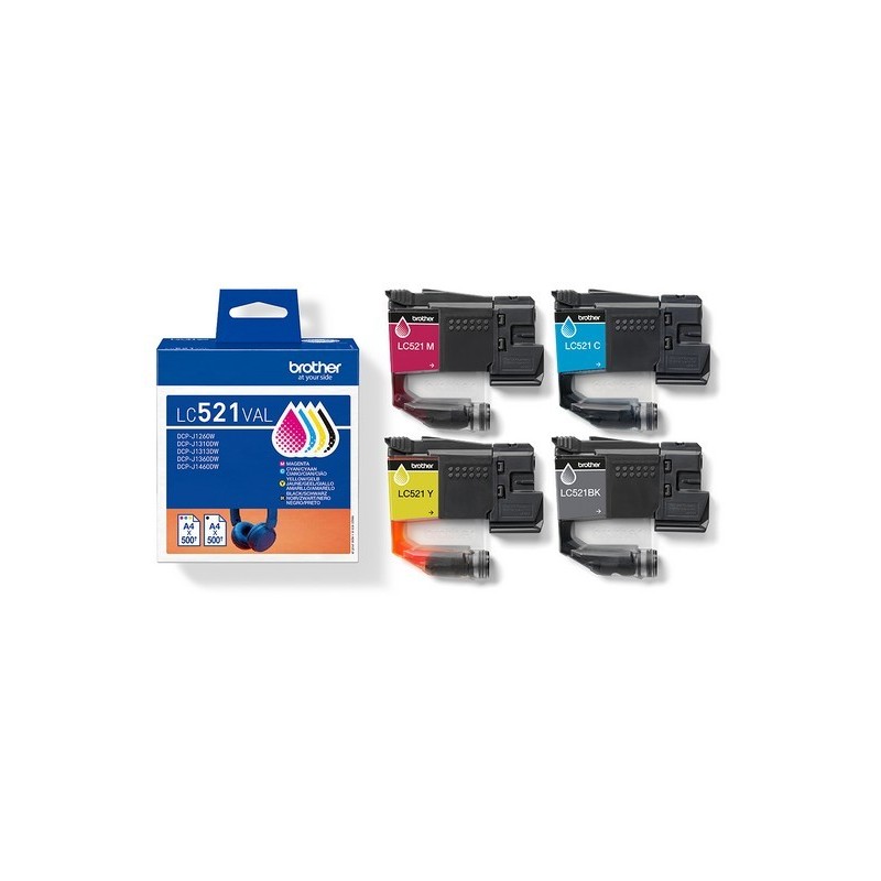 Produit: Désignation: BROTHER Value pack CMYK up to 4x500 pages Description: Brother LC521 Value Pack - Pack de 4 - noir. jaune. cyan. magenta - original - boîte de suspension - cartouche d'encre - pour Brother DCP-J1260W. DCP-J1310DW Code EAN: 4977766842150 Garantie Fabricant : 12 mois de garantie retour atelier Consommable Type de consommable: Cartouche d'encre Technologie d'impression: Jet d'encre Couleur: Noir. jaune. cyan. magenta Nombre inclus: Pack de 4 Rendement: Jusqu'à 500 pages ISO/IEC 24711 Consommables inclus: 1 x cartouche d'encre (noir) - jusqu'à 500 pages 1 x cartouche d'encre (cyan) - jusqu'à 500 pages 1 x cartouche d'encre (magenta) - jusqu'à 500 pages 1 x cartouche d'encre (jaune) - jusqu'à 500 pages Divers Type de Conditionnement: Boîte de suspension Information de compatibilité Compatible avec: Brother DCP-J1260W. DCP-J1310DW